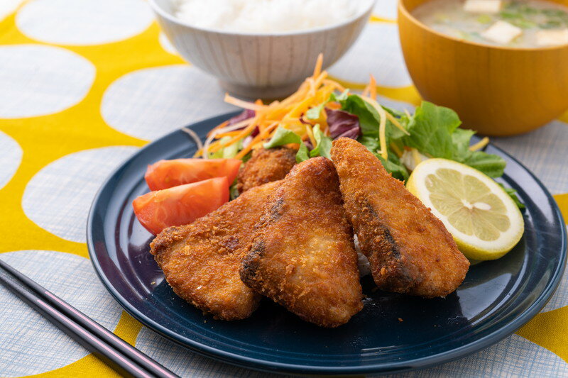旬の時期(5月〜8月)に水揚げされた真アジと、12月から2月に水揚げされた寒ブリのフライセット。