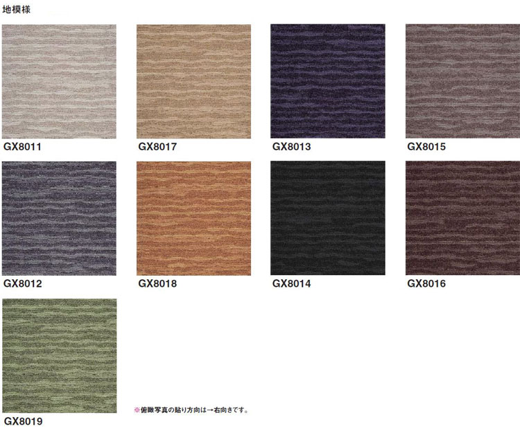 GX-8000 : ソコイタリ インスピレーションの商品説明 ・パイル BCFナイロン100% ・パッキング 塩ビ樹脂+ガラス繊維布 ・パイル長 H5mm L3mm テクスチャードループパイル ・全厚 7.5mm ・寸法 500mm×500mm ・密度 1/12ゲージ 12.5ステッチ ・防炎 防炎性能試験番号 EO070165 ・制電 人体帯電圧1.0kv以下 ・防汚 フッ素系樹脂による防汚加工 ・ホルムアルデヒド放散等級 インテリアファブリックス性能評価協議会認定 認定番号J07-30442 ・品番 GX8011(ベージュ系) / GX8017(ブラウン系) / GX8012(グレー系) GX8018(ブラウン系) / GX8013(ネイビー系) / GX8015(ブラウン系) GX8014(ブラック系) / GX8016(ブラウン系) / GX8019(グリーン系) GX8021(ベージュ系) / GX8027(ブラウン系) / GX8022(グレー系) GX8028(ブラウン系) / GX8023(ネイビー系) / GX8025(ブラウン系) GX8024(ブラック系) / GX8026(ブラウン系) / GX8029(グリーン系) ※流し貼りを推奨いたします。